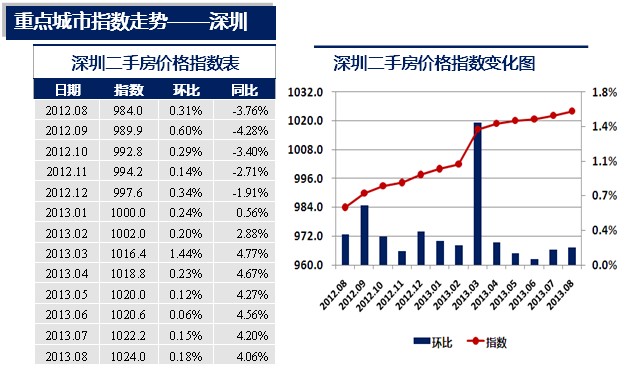2013年8月,深圳二手房價格指數為1024.0點,較上月上升了1.8點,環比上漲0.18%,漲幅較上月擴大了0.03個百分點,同比上漲4.06%。