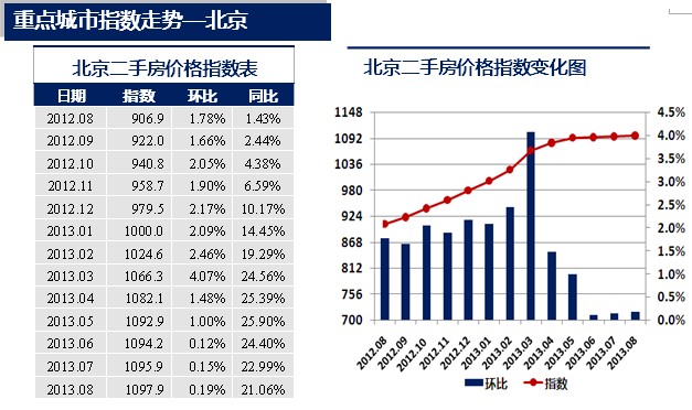 2013年8月,北京二手房交易價格指數為1097.9點,較上月上升2.0點,環比上漲0.19%,漲幅較上月擴大了0.04個百分點。同比上漲21.06%。