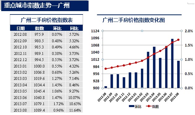 2013年8月,廣州二手房價格指數為1089.4點,較上月上升10.3點,環比上漲0.96%,漲幅較上月縮小了0.76個百分點。同比上漲11.64%。