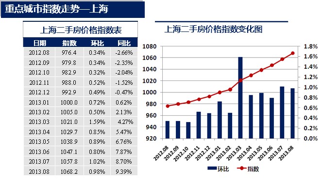 2013年8月,上海二手房價格指數為1068.2點,較上月上升10.4點,環比上漲0.98%,漲幅較上月縮小了0.04個百分點。同比上漲9.39%。