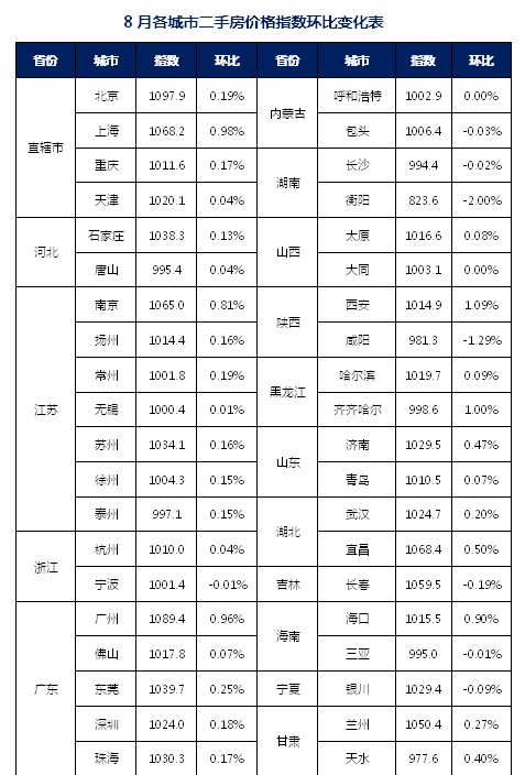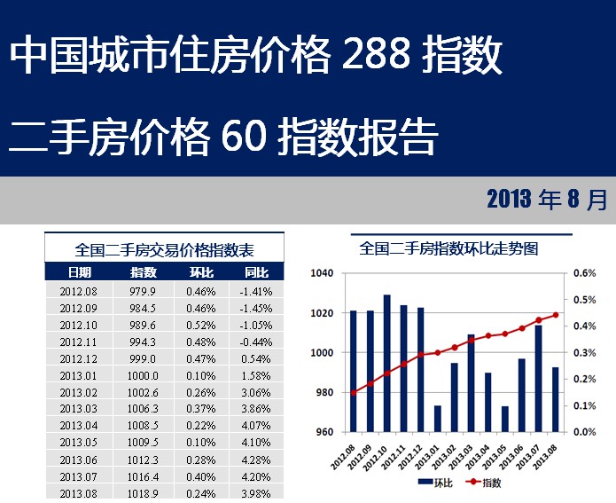 2013年8月,中國城市住房價格288指數——二手房價格60指數為1018.9點,較上月上升2.5點,環比上漲0.24%,漲幅較上月縮小了0.16個百分點,同比上漲3.98%。指數環比數據延續了近一年來的上漲走勢。