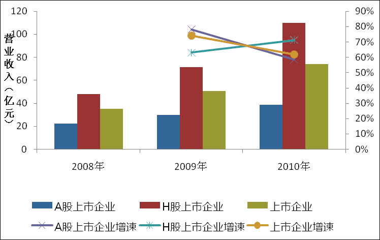 2010年,上市房地產(chǎn)企業(yè)業(yè)績(jī)保持快速增長(zhǎng),營(yíng)業(yè)收入平均值為74.15億元,同比上升61.84%。從近三年內(nèi)上市企業(yè)營(yíng)業(yè)收入變化情況可以看出,企業(yè)總體營(yíng)業(yè)收入水平呈上升趨勢(shì),但增速明顯下降。另外,A股和H股上市企業(yè)的營(yíng)業(yè)收入情況有所不同。其中,A股上市房地產(chǎn)企業(yè)在2009年的營(yíng)業(yè)收入增速為78.20%,2010年的營(yíng)業(yè)收入增速下降了20個(gè)百分點(diǎn),為58.37%。而港股的上市房地產(chǎn)企業(yè)營(yíng)業(yè)收入增速在2010年提升至71.22%,環(huán)比上升了8個(gè)百分點(diǎn),其中不乏眾多擴(kuò)張意愿強(qiáng)烈的實(shí)力企業(yè)支撐,營(yíng)業(yè)收入總額達(dá)到4165億元。