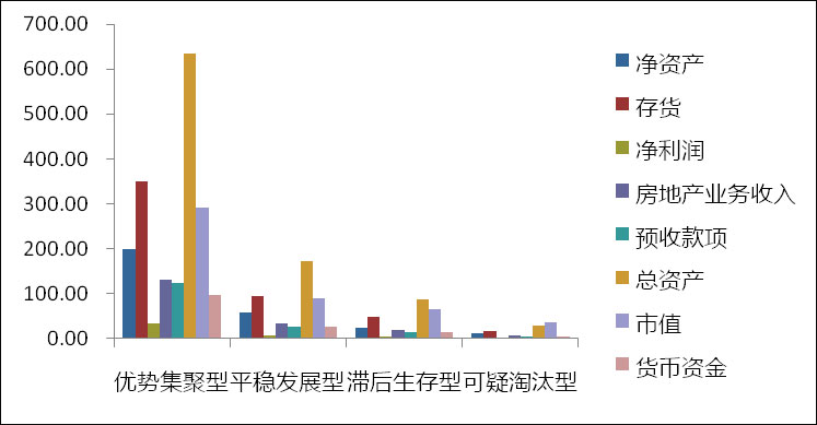 2010年上市房地產(chǎn)企業(yè)負(fù)債情況不容樂(lè)觀,資產(chǎn)負(fù)債率指標(biāo)普遍高企,資產(chǎn)負(fù)債率均值為66% 。其中優(yōu)勢(shì)聚集型企業(yè)資產(chǎn)負(fù)債率均值為65%,低于行業(yè)平均水平。但優(yōu)勢(shì)集聚型企業(yè)在償債能力上優(yōu)于后者,貨幣資金、凈資產(chǎn)、凈利潤(rùn)等指標(biāo)明顯高于其余類型企業(yè),均值分別為97.04億元、199.09億元,32.62億元。